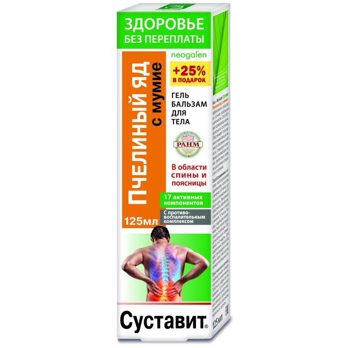 Gel-balm for the body Joint. Bee venom. Shilajit. 17 active components" of the trademark Neogalen (Neogalen) of the series "Health without overpayment" is an effective remedy based on natural ingredients. Contributes to the normalization of the functional state. Provides building blocks for active renewal and flexibility. Stimulates natural tissue regeneration, prevents the development of destructive processes and aging. The action and effectiveness of the gel-balm are provided by the high biological activity of its natural components, which have a pronounced positive complex effect. Bee venom (apitoxin, from Latin apis - "bee", toxikon - "poison") is a product of the secretory activity of the poisonous glands of honey bees, a highly effective natural remedy for a wide range of diseases.Especially good results (up to 98%) are achieved in the treatment of diseases of the joints and spine. It has a pronounced anti-inflammatory, warming, analgesic, bactericidal, immunocorrecting effect, activates blood flow, improves joint metabolism and nutrition of joint tissues. By increasing the permeability of the skin, it contributes to the deep penetration of therapeutic components into the problem area. Shilajit (Asphaltum) - one of the most powerful biostimulants, activates reparative processes, accelerates the restoration of bone and cartilaginous tissues, slows down the aging process of the joint, helps to reduce aches that occur when the weather changes. Enhances the medicinal properties of medicinal plants several times. Chondroitin sulfate is the main structural component of cartilage and a natural protector (chondroprotector) of its cells.Produced by the cartilage tissue of the joints. Increases the moisture content of the cartilage, prevents it from drying out. Provides mechanical and elastic properties of articular surfaces, improves the quality of joint lubrication (synovial fluid). Glucosamine hydrochloride is an integral element of cartilage tissue. Provides the production of chondroitin, improves metabolic processes in the joints. Stimulates the production of glucosaminoglucans needed for cartilage repair. Promotes the regeneration of damaged cartilage in inflammatory and destructive processes. Reduces pain Comfrey (larkspur) has been known in medicine for about 2 thousand years. Promotes the restoration of damaged tissues, especially bone, Stimulates the regeneration of bone and cartilage tissue in diseases of the joints, improves the quality of synovial fluid, heals joint microtraumas,accelerates the fusion of bones in fractures. The roots contain a record amount of aplantoin, polysaccharides, alkaloids, glycosides, polyphenols, triterpene saponins, phytosterols, tannins, coumarins, organic acids. Marsh cinquefoil is a medicinal plant with a pronounced biostimulating, antibacterial, analgesic, anti-inflammatory, salt-removing, antirheumatic and regenerating effect. It has numerous medicinal properties. Contains trace elements (phosphorus, potassium, magnesium, copper), tannins, flavonoids, essential oils, organic acids, carotene. A recognized folk remedy for combating rheumatism, radiculitis, arthritis and arthrosis, salt deposition in the joints of the hands and feet. Helps relieve puffiness, increases the mobility of joints and spine. Adam's root,thanks to the pectins and fatty oils included in its composition, it has a bactericidal effect, activates blood circulation, stimulates the nerve endings of the skin, deeply warms the sore spot. The action of Adam's root is equated with acupuncture. It is widely used in folk medicine in the treatment of rheumatism, sciatica, radiculitis, polyarthritis, spurs, bruises, bursitis, arthrosis. Capsaicin - an extract from red pepper, increases the rate of enzymatic reactions, improves microcirculation and metabolism, increases the elasticity of muscle connective tissue, blocks pain and has a long-term warming effect. The essential oils of medicinal plants have a regenerating, analgesic, anti-inflammatory, anti-edema effect. They are widely used in medicine in the treatment of rheumatism, arthritis, osteochondrosis, gout, microcirculation disorders.