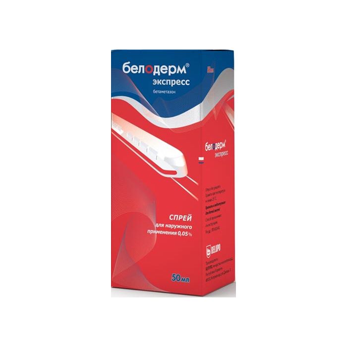 The drug is intended for external use only. < br> Beloderm express, spray for external use is sprayed on the affected area of the skin in the amount necessary to cover the affected surface, 2 times a day. < br> The duration of treatment depends on the effectiveness and tolerability of therapy and is usually no more than 4 weeks. The therapy may be repeated within a year. In children and in patients with facial skin lesions, the course of treatment should not exceed 5 days. If clinical improvement does not occur, the diagnosis must be clarified. < br> To evenly cover a skin area of 100 cm2, apply 2 ml of spray, which corresponds to 1 mg of betamethasone (that is, 13 smooth and full pressings on the dispenser the dose of the drug with one press on the dispenser is 0.15 ml and contains 0.075 mg of betamethasone ).