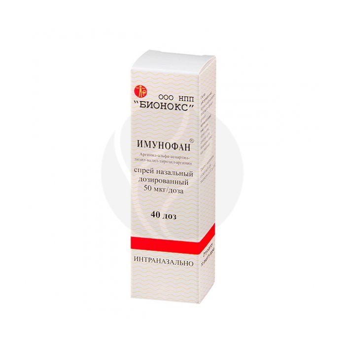 Intranasally. When using, the bottle should be held vertically with the spray up. Remove the protective cap from the sprayer. Before the first use, fill the dosing pump by pressing the wide rim of the sprayer 3-4 times. Insert the nebulizer into the nasal passage with the head upright. Press the wide rim of the spray gun once until it stops. One dose of the drug contains 45 mcg of Imunofan. The daily dose should not exceed 180 mcg.