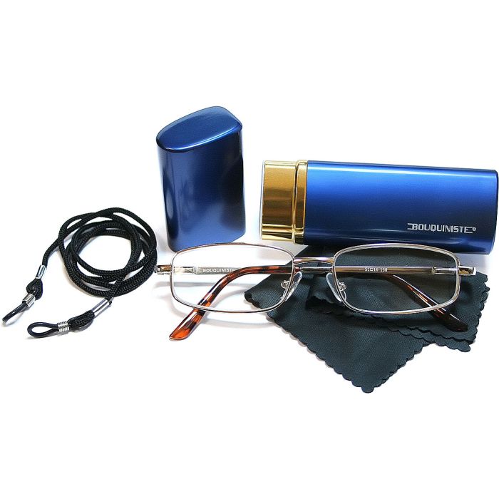 Bouquiniste 4-in-1 set - classic design sturdy reading glasses with spring arms, custom blue metal case, eyeglass cleaning cloth and cord.