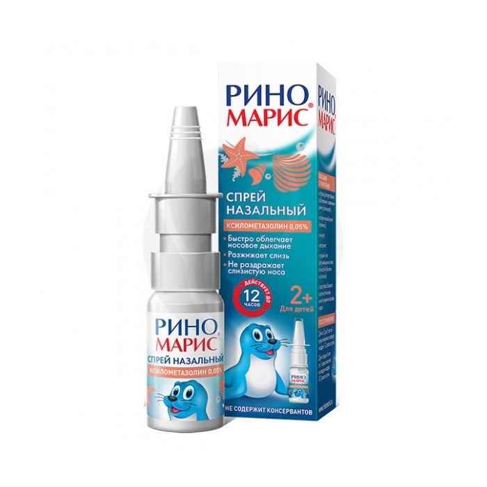 The drug is for intranasal use. Xylometazoline has an alpha-adrenomimetic effect: it causes narrowing of the blood vessels of the nasal mucosa and thus eliminates edema and hyperemia of the nasopharyngeal mucosa. Eases nasal breathing with rhinitis. In therapeutic concentrations, it does not irritate the mucous membrane, does not cause hyperemia. The action occurs within a few minutes after application and lasts for 12 hours. Sterilized sea water, which is part of the RinomarisЃ preparation, helps to maintain the normal physiological state of the nasal mucosa, liquefy mucus and normalize its production in the goblet cells of the nasal mucosa. Trace elements improve the function of the ciliated epithelium, which helps to reduce side local reactions,such as irritation and / or dryness of the nasopharyngeal mucosa.