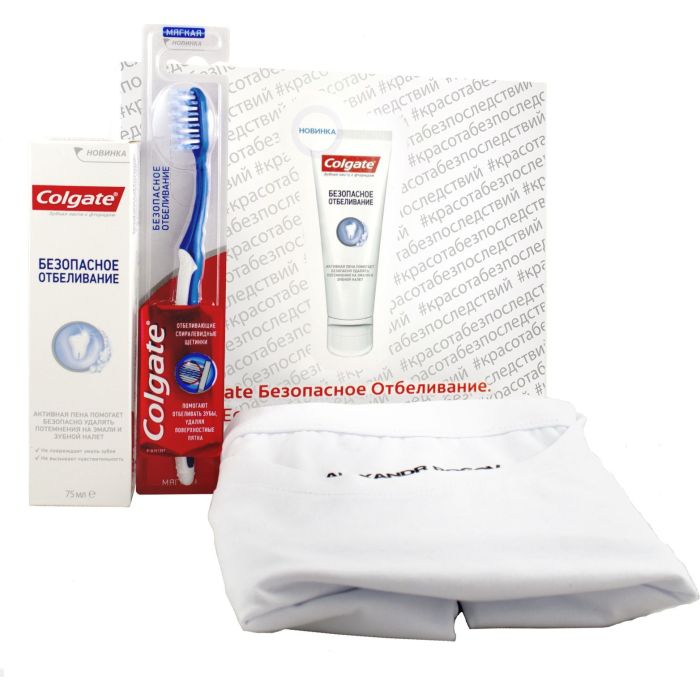 In this unique set you will find products to support your natural beauty day after day - a basic white T-shirt from the limited collection of Alexander Rogov, toothpaste and a Colgate Safe Whitening toothbrush.