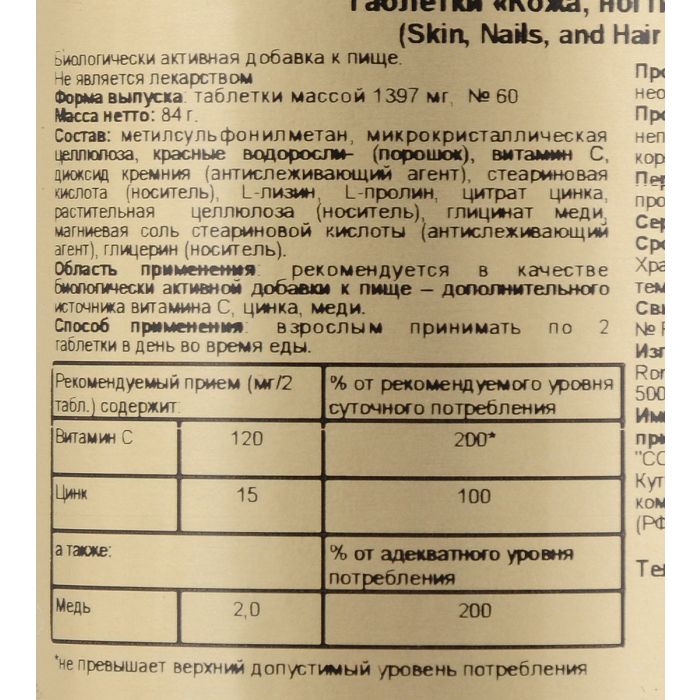 Methylsulfonylmethane - 500 mg, red algae - 75 mg, vitamin C, L-proline, L-lysine, zinc citrate, copper glycinate.