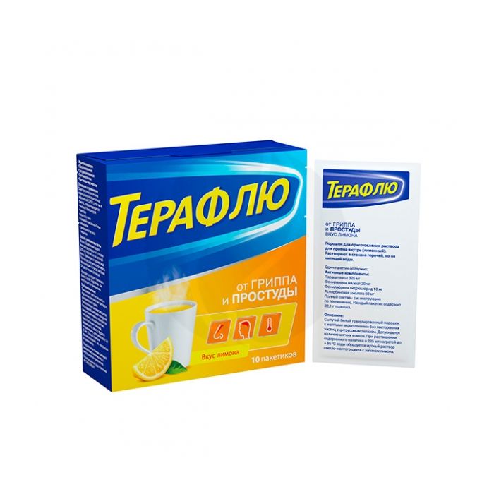 TERAFLU WITH LEMON TASTE for flu and colds in an economical package with the benefit of 3 sachets *. Powder for preparation of solution for oral administration is intended for the symptomatic treatment of infectious and inflammatory diseases (ARVI, including influenza), the manifestations of which are: